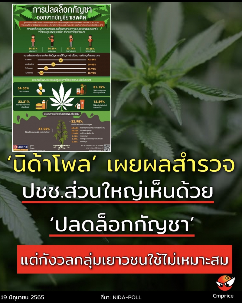 ‘นิด้าโพล’ เผยผลสำรวจ ปชช.ส่วนใหญ่เห็นด้วย ‘ปลดล็อกกัญชา’ แต่ก็กังวลกลุ่มเยาวชนใช้ไม่เหมาะสม