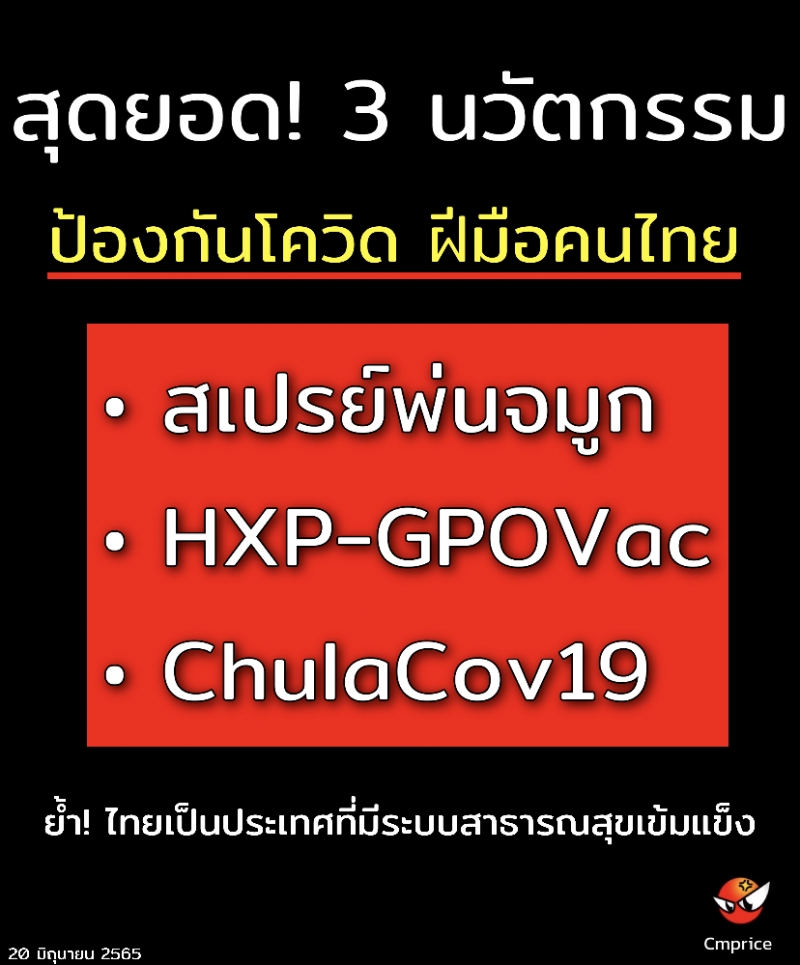 | • สุดยอด! 3 นวัตกรรมป้องกันโรคโควิด ฝีมือคนไทย สเปรย์พ่นจมูก - HXP-GPOVac - ChulaCov19 คืบหน้า |