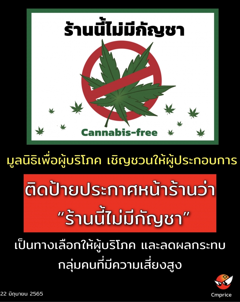 | • มูลนิธิเพื่อผู้บริโภค เชิญชวนให้ผู้ประกอบการติดป้ายประกาศหน้าร้านว่า ร้านนี้ไม่มีกัญชา เพื่อเป็นทางเลือกให้กับผู้บริโภค และลดผลกระทบ กลุ่มคนที่มีความเสี่ยงสูง |