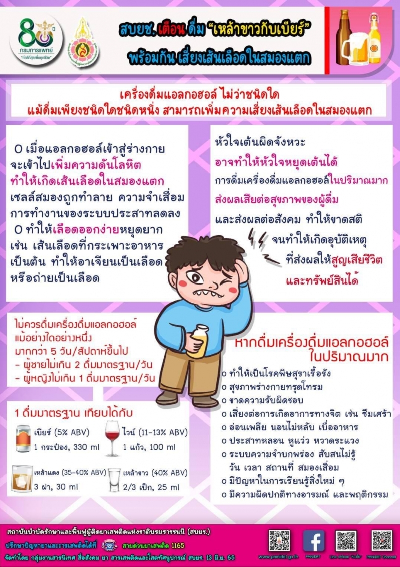 ในสมองแตกได้ ซึ่งผู้ที่นิยมดื่มเครื่องดื่มแอลกอฮอล์ควรดื่มในปริมาณที่เหมาะสม ไม่ควรดื่มมากกว่า 5 วันต่อสัปดาห์ขึ้นไป (อ้างอิงจากแบบประเมินปัญหาการดื่มสุรา AUDIT : WHO 2001) โดยในผู้ชายไม่เกิน 2 ดื่มมาตรฐาน และผู้หญิงไม่เกิน 1 ดื่มมาตรฐาน ต่อวัน (1 ดื่มมาตรฐาน เทียบได้กับ เบียร์ที่มีแอลกอฮอล์ไม่เกิน 5% 1 กระป๋องหรือ 330 มิลลิลิตร, ไวน์ที่มีแอลกอฮอล์ 11-13% 1 แก้วหรือ 100 มิลลิลิตร, เหล้าแดงที่มีแอลกอฮอล์ 35-40% 3 ฝาหรือ 30 มิลลิลิตร, เหล้าขาวที่มีแอลกอฮอล์ 40% 2/3 เป็กหรือ 25 มิลลิลิตร) ทั้งนี้หากประสบปัญหาเกี่ยวกับยาและสารเสพติดสามารถขอรับคำปรึกษาเรื่องยาและสารเสพติดได้ที่ สายด่วนยาเสพติด 1165 สอบถามข้อมูลเพิ่มเติมได้ที่www.pmnidat.go.th หรือเข้ารับการบำบัดรักษายาเสพติดได้ที่ สถาบันบำบัดรักษาและฟื้นฟูผู้ติดยาเสพติดแห่งชาติบรมราชชนนี (สบยช.) กรมการแพทย์ จังหวัดปทุมธานีและโรงพยาบาลธัญญารักษ์ในส่วนภูมิภาคทั้ง 6 แห่ง ได้แก่โรงพยาบาลธัญญารักษ์เชียงใหม่ โรงพยาบาลธัญญารักษ์แม่ฮ่องสอน โรงพยาบาลธัญญารักษ์ขอนแก่น โรงพยาบาลธัญญารักษ์อุดรธานี โรงพยาบาลธัญญารักษ์สงขลา และโรงพยาบาลธัญญารักษ์ปัตตานี