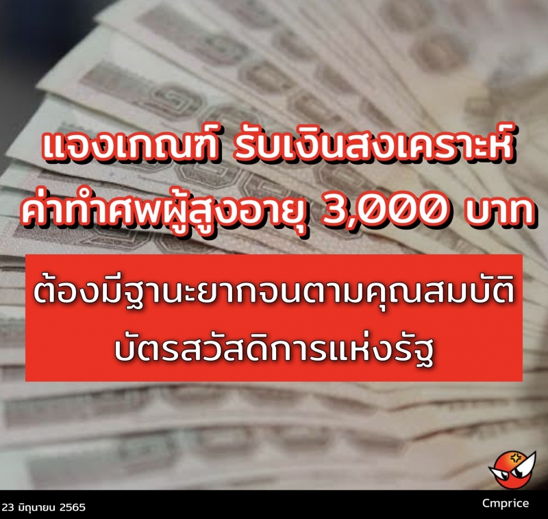 | • แจงเกณฑ์ รับเงินสงเคราะห์ค่าทำศพผู้สูงอายุ 3,000 บาท ต้องมีฐานะยากจนตามคุณสมบัติบัตรสวัสดิการแห่งรัฐ |