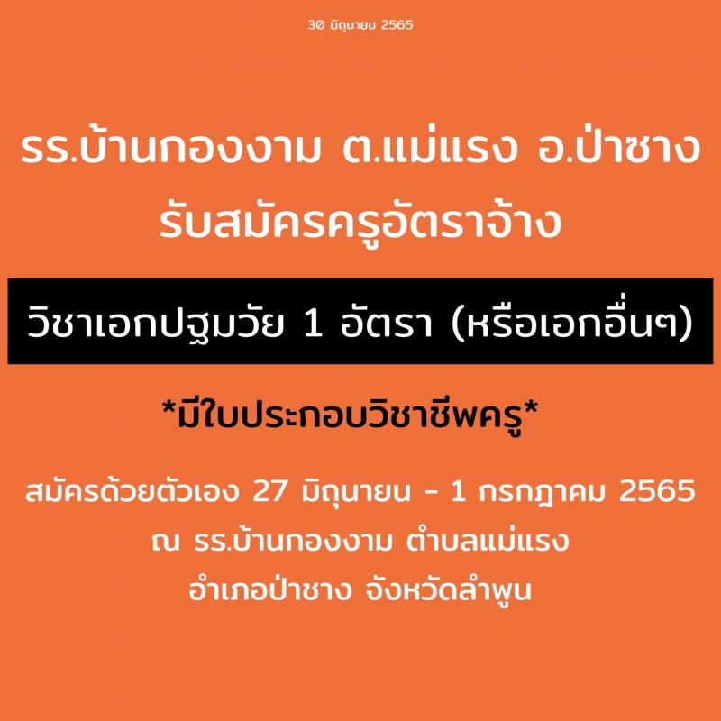 ด้วยโรงเรียนบ้านกองงาม สำนักงานเขตพื้นที่การศึกษาประถมศึกษาลำพูน เขต ๑ มีความประสงค์รับสมัครบุคคลทั่วไปเพื่อจัดจ้างเป็นลูกจ้างชั่วคราว ปฏิบัติงานตำแหน่ง ครูจ้างสอน จำนวน ๑ อัตรา ดังนี้