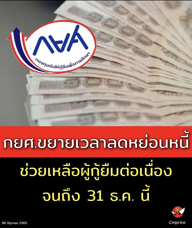 นายชัยณรงค์ กัจฉปานันท์ ผู้จัดการกองทุนเงินให้กู้ยืมเพื่อการศึกษา (กยศ.) เปิดเผยว่า ในช่วงสถานการณ์การแพร่ระบาดของโรค COVID-19 ที่ผ่านมา กองทุนฯ ได้มีมาตรการลดหย่อนหนี้เพื่อบรรเทาความเดือดร้อนของผู้กู้ยืมที่อยู่ระหว่างการชำระหนี้ที่ได้รับผลกระทบทางเศรษฐกิจ โดยขณะนี้ คณะกรรมการกองทุนฯ เห็นชอบขยายระยะเวลามาตรการลดหย่อนหนี้ เพื่อจูงใจให้ผู้กู้ยืมมาชำระเงินคืน จากเดิมสิ้นสุดวันที่ 30 มิถุนายน 2565 เป็นสิ้นสุดวันที่ 31 ธันวาคม 2565 รวมระยะเวลา 6 เดือน โดยมีเงื่อนไขมาตรการ ลดดอกเบี้ยเงินกู้ยืมจากเดิม 1% ต่อปี เป็น 0.01% ต่อปี