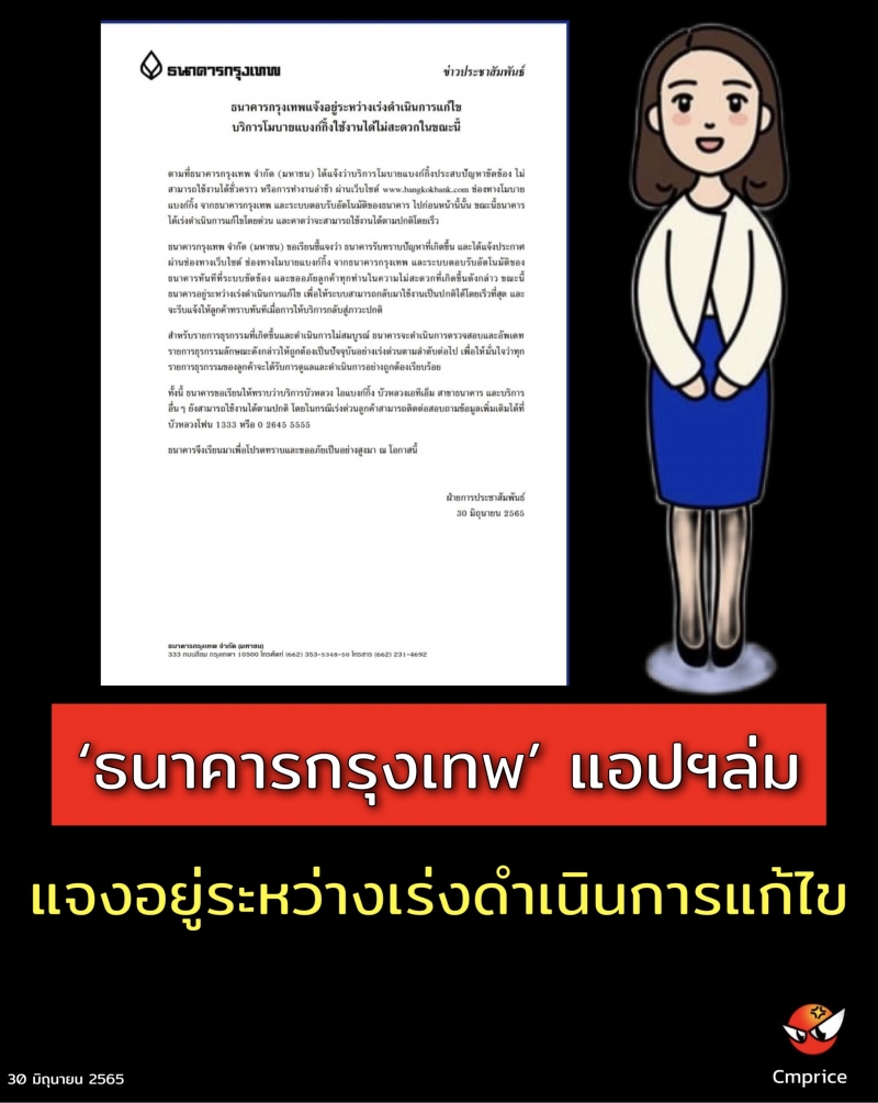 ธนาคารกรุงเทพ จำกัด (มหาชน) ขอเรียนชี้แจงว่า ธนาคารรับทราบปัญหาที่เกิดขึ้น และได้แจ้งประกาศ