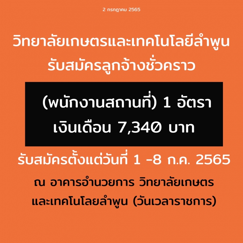 วิทยาลัยเกษตรและเทคโนโลยีลำพูน รับสมัครลูกจ้างชั่วคราว (พนักงานสถานที่) 1 อัตรา เงินเดือน 7,340 บาท