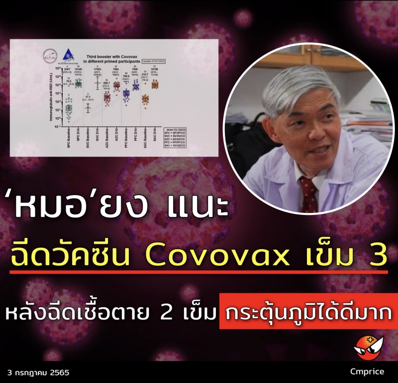 ศ.นพ.ยง ภู่วรวรรณ หัวหน้าศูนย์เชี่ยวชาญเฉพาะทางด้านไวรัสวิทยา คลินิกภาควิชากุมารเวชศาสตร์ คณะแพทยศาสตร์ จุฬาลงกรณ์มหาวิทยาลัย โพสต์ผ่านเฟซบุ๊ก Yong Poovorawan ระบุว่าโควิด 19 ภูมิต้านทานเมื่อกระตุ้นด้วย Covovax หรือที่เรารู้จักต้นตำรับคือ Novavax