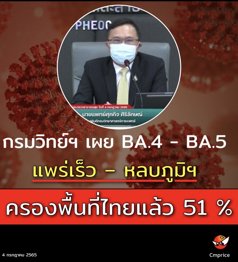 | • กรมวิทย์ฯ เผย BA.4 - BA.5 แพร่เร็ว หลบภูมิฯ ทำระบาดก้าวกระโดดครองพื้นที่ไทยแล้ว 51 % รอผลความรุนแรง |