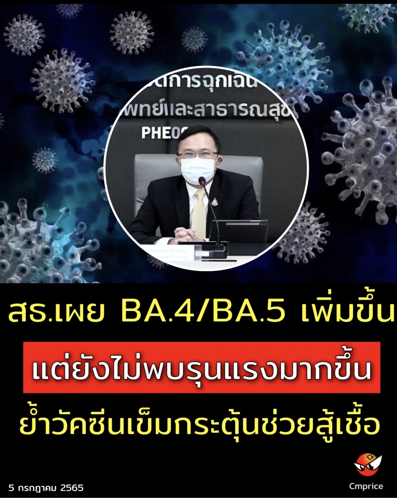 วันนี้ (4 กรกฎาคม 2565) ที่กระทรวงสาธารณสุข จ.นนทบุรี นพ.ศุภกิจ ศิริลักษณ์ อธิบดีกรมวิทยาศาสตร์การแพทย์ พร้อมด้วย นพ.บัลลังก์ อุปพงษ์ รองอธิบดีกรมวิทยาศาสตร์การแพทย์ ดร.นพ.อาชวินทร์ โรจนวิวัฒน์ ผู้อำนวยการสถาบันวิจัยวิทยาศาสตร์สาธารณสุข แถลงข่าวการเฝ้าระวังโควิด 19 สายพันธุ์ BA.4 และ BA.5 ว่า จากการตรวจสายพันธุ์เบื้องต้นช่วงวันที่ 25 มิถุนายน - 1 กรกฎาคม 2565 พบว่าเป็นสายพันธุ์โอมิครอน 100% จำนวนนี้เป็นสายพันธุ์ย่อย BA.4/BA.5 ครึ่งหนึ่งคือ 51.58% เพิ่มขึ้นจาก 2 สัปดาห์ก่อนที่พบจากประมาณ 6.7% และ 44.3% คาดว่าอีกไม่นานจะแทนที่ตัวเก่า BA.2 ซึ่งขณะนี้พบ 47.15% ส่วนผู้ป่วยในโรงพยาบาลที่เริ่มกลับมาพบมากขึ้นนั้น ยังไม่ชัดเจนว่าเกิดจากเชื้อ BA.4/BA.5 ทำให้มีความรุนแรงเพิ่มขึ้น ซึ่งยังต้องรอการพิสูจน์ เนื่องจากตามปกติเมื่อมีการติดเชื้อมากขึ้น สัดส่วนของผู้ป่วยอาการหนักก็จะเพิ่มมากขึ้นตามไปด้วย