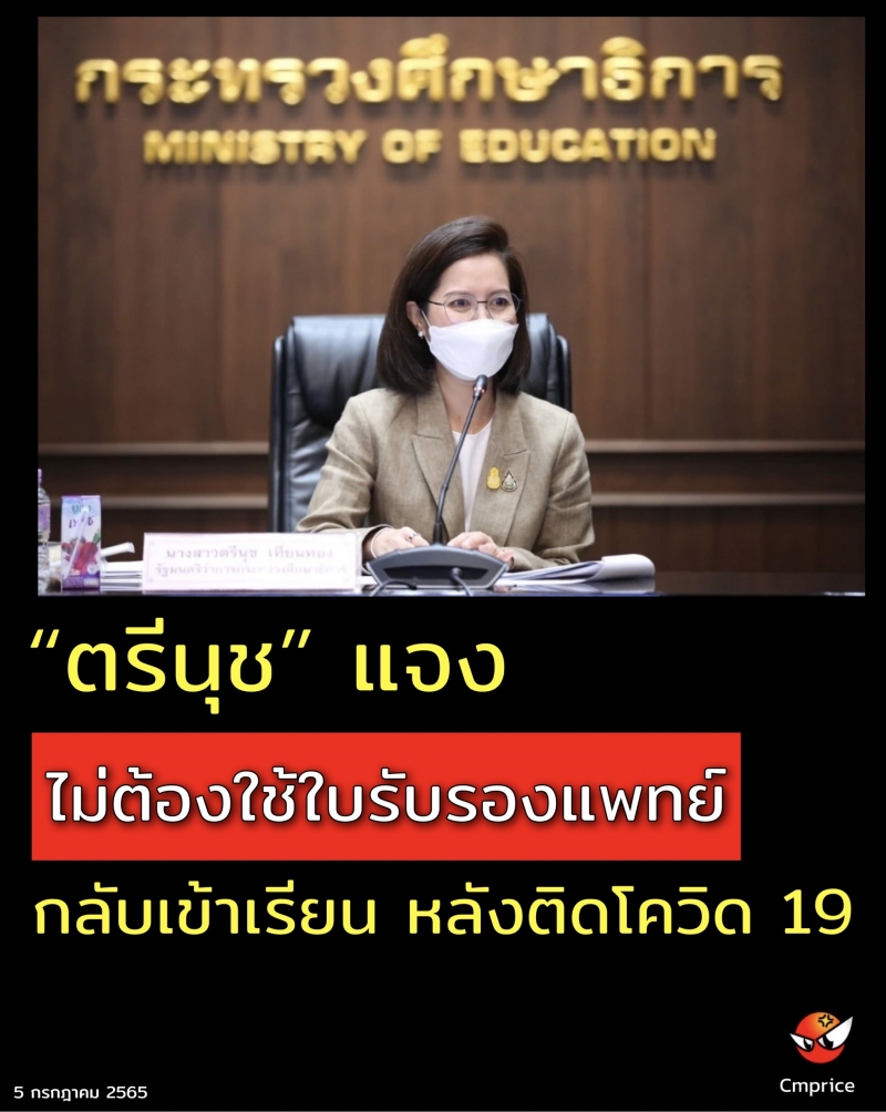 | • ตรีนุช แจงไม่ต้องใช้ใบรับรองแพทย์กลับเข้าเรียน หลังติดโควิด 19 |