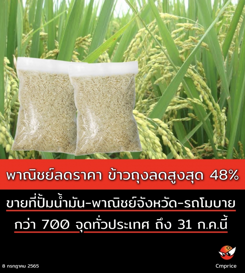 กระทรวงพาณิชย์ จัดโครงการพาณิชย์ลดราคา! ช่วยประชาชน (ข้าวถุงราคาประหยัด) Lot 19 เริ่มตั้งแต่วันนี้- 31 กรกฎาคม 2565 โดยขายข้าวบรรจุถุงราคาถูก มีทั้งข้าวหอมมะลิ ข้าวหอมผสม ข้าวขาว และข้าวเหนียว บรรจุถุงหลายขนาดตั้งแต่ 1 กก. 5 กก. และ 48 กก. รวม 228 ยี่ห้อ รวมปริมาณข้าวที่เข้าร่วมโครงการจำนวน 1.5 ล้านกิโลกรัม หรือ 1,500 ตัน