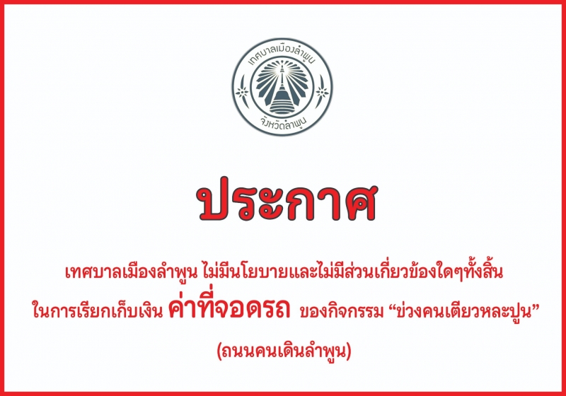 เรียนทุกท่าน จากกรณี มีผู้ร้องเรียน เรื่องการจัดเก็บค่าจอดรถในกิจกรรมโครงการข่วงคนเตียว “ถนนคนเดินลำพูน” ทุกวันศุกร์ เทศบาลเมืองลำพูน จึงขอประกาศ!! เน้นย้ำให้พี่น้องประชาชนได้รับทราบว่า เทศบาลเมืองลำพูน ไม่มีนโยบายและไม่มีส่วนเกี่ยวข้องใดๆทั้งสิ้น ในการเรียกเก็บเงินค่าที่จอดรถของกิจกรรม “ข่วงคนเตียวหละปูน” (ถนนคนเดินลำพูน) #เทศบาลเมืองลำพูน #ท่องเที่ยวจังหวัดลำพูน #ถนนคนเดินลำพูน