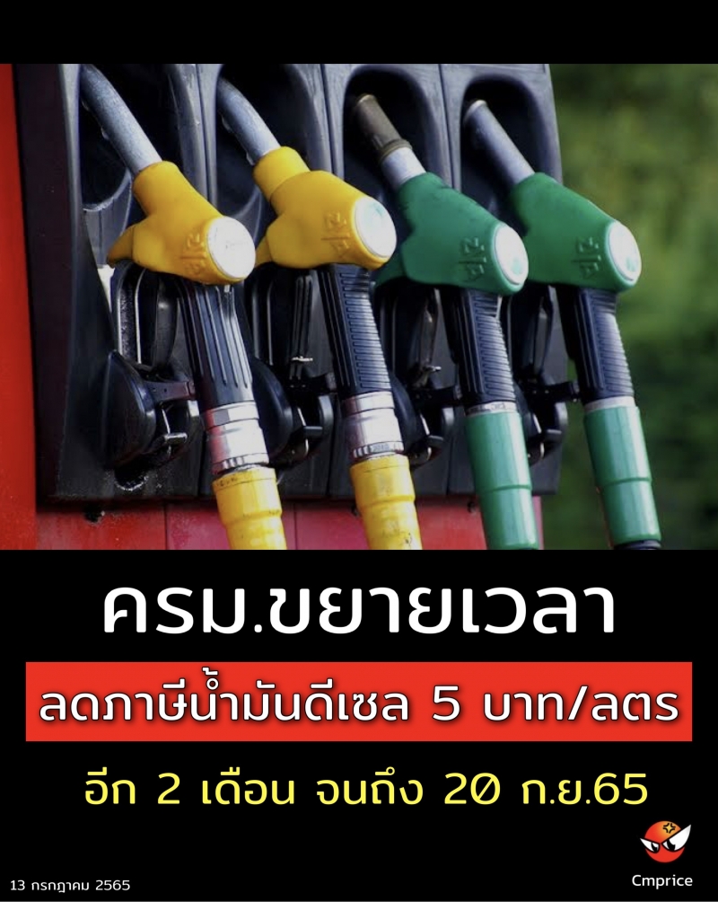 (12 ก.ค. 65) คณะรัฐมนตรี เห็นชอบการปรับลดอัตราภาษีสรรพสามิตน้ำมันดีเซลและน้ำมันอื่นๆ ที่คล้ายกัน ประมาณลิตรละ 5 บาท ต่อไปอีก 2 เดือน ต่อเนื่องจากการปรับลดภาษีสรรพสามิตสินค้าน้ำมันดีเซล ตามมาตรการภาษีในระยะสั้นที่ผ่านมาว่า จะมีผลจนถึงวันที่ 20 ก.ค. 65
