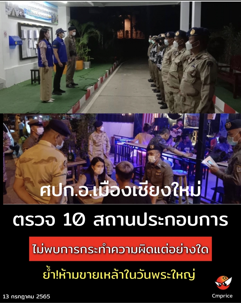 ศปก.อ.เมืองเชียงใหม่ตรวจ 10 สถานประกอบการไม่พบการกระทำความผิดแต่อย่างใด ย้ำ!ห้ามขายเหล้าในวันพระใหญ่