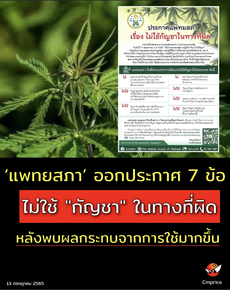 | • แพทยสภา ออกประกาศ 7 ข้อ ไม่ใช้ "กัญชา" ในทางที่ผิด หลังพบผลกระทบจากการใช้มากขึ้น |