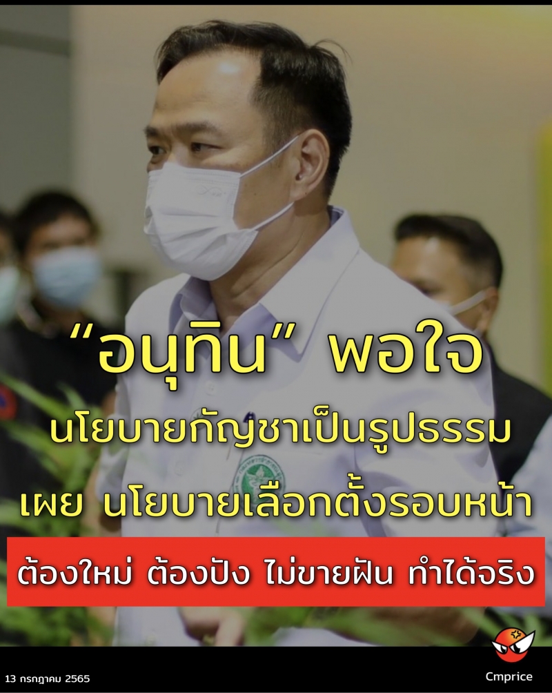 “อนุทิน” พอใจนโยบายกัญชาเป็นรูปธรรม ประชาชนเข้าใจเป้าหมาย เป็นไปเพื่อการแพทย์ เตือนสายเมา หมิ่นเหม่ผิดกฎหมาย มีโทษจำ ปรับ เผย นโยบายเลือกตั้งรอบหน้า ต้องใหม่ ปัง ประชาชนได้ประโยชน์ ที่สำคัญ ทำได้จริง