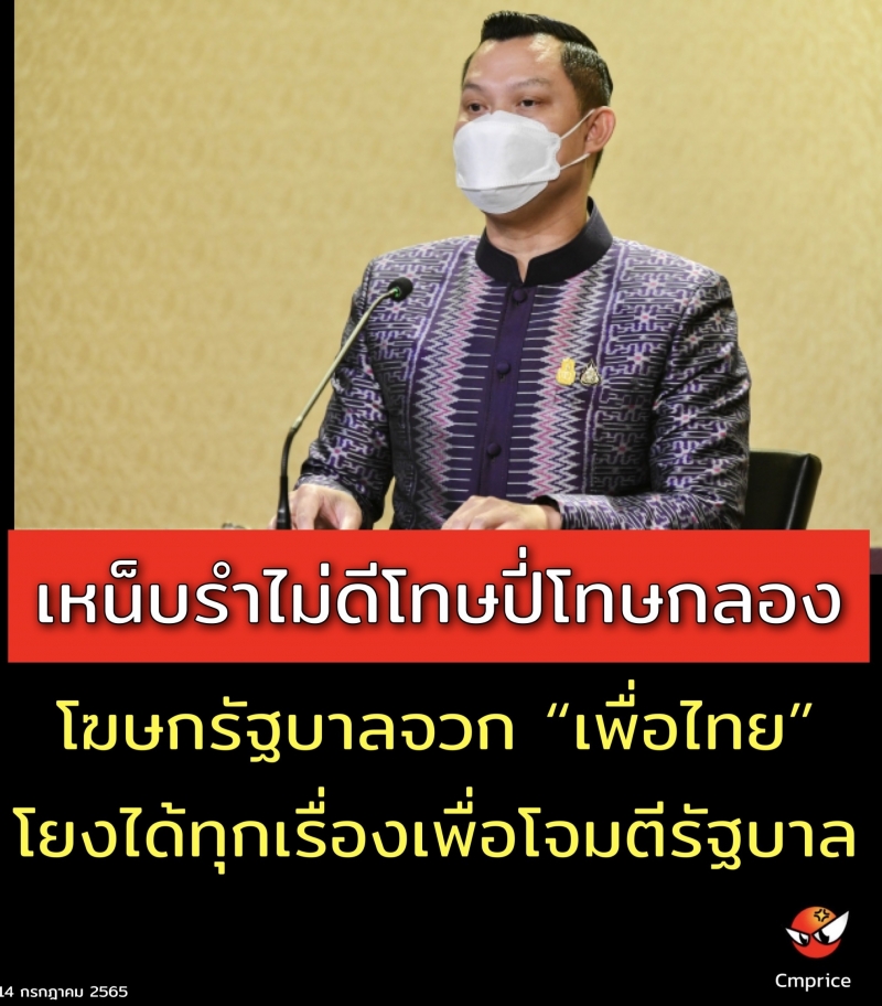 | • โฆษกรัฐบาลจวก เพื่อไทย โยงได้ทุกเรื่องเพื่อโจมตีรัฐบาล เหน็บรำไม่ดีโทษปี่โทษกลอง เชื่อไร้หลักฐานเด็ด จนต้องรีบโยนบาปให้คนอื่นล่วงหน้าเพื่อรักษาหน้า |
