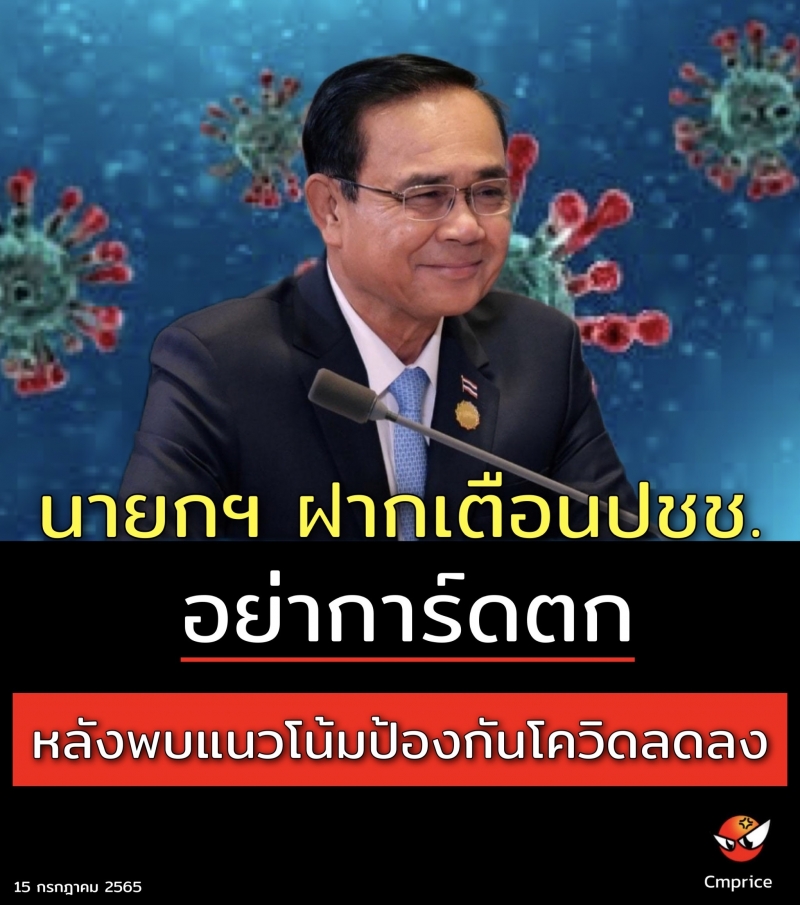 นายกรัฐมนตรี ฝากเตือนประชาชน อย่าการ์ดตก เน้นปฏิบัติตามมาตรการของสาธารณสุข สวมหน้ากากอนามัยในพื้นที่เสี่ยง เว้นระยะห่าง ล้างมือ และเข้ารับการฉีดวัคซีน เพื่อไม่ให้สถานการณ์กลับไปรุนแรงอีก ทั้งนี้ กำชับกระทรวงสาธารณสุข ติดตามและประเมินสถานการณ์ตลอดช่วงวันหยุดนี้อย่างใกล้ชิด