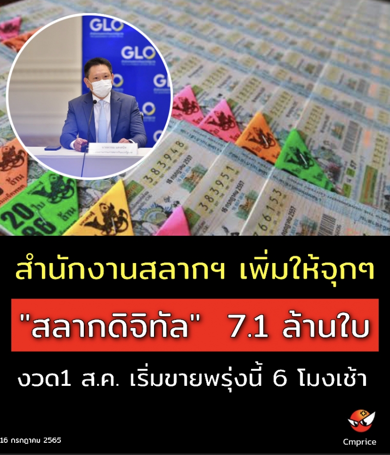 นายลวรณ แสงสนิท ประธานกรรมการสลากกินแบ่งรัฐบาล เปิดเผยว่า สำนักงานสลากฯ พร้อมเปิดจำหน่ายสลากดิจิทัล งวดที่ 4 ผ่านแอพพลิเคชันเป๋าตัง ตั้งแต่ 6 โมงเช้า ของวันที่ 17 ก.ค.65 เป็นต้นไป โดยงวดนี้จะมีสลากจำหน่ายเพิ่มเป็น 7,167,500 ใบ เพิ่มจากเดิมที่มี 5.1 ล้านใบ เพื่อให้สอดคล้องกับปริมาณความต้องการสลากของผู้ซื้อ หลังจากงวดที่ผ่านมามีการจำหน่ายหมดไวกว่าที่คาด โดยใช้เวลาไม่ถึง 2 วัน