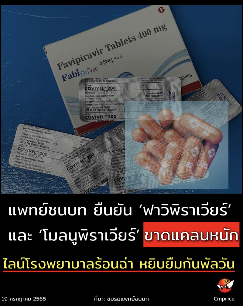 ฟาวิพิราเวียร์ และ โมลนูพิราเวียร์ขาดแคลนอย่างหนัก ไลน์โรงพยาบาลร้อนฉ่า หยิบยืมฟาวิกันพัลวัน คนหนึ่งต้องใช้ฟาวิอย่างต่ำ 50 เม็ด หรือถ้าเป็นโมลนูพิราเวียก็คนละอย่างต่ำ 40 เม็ด