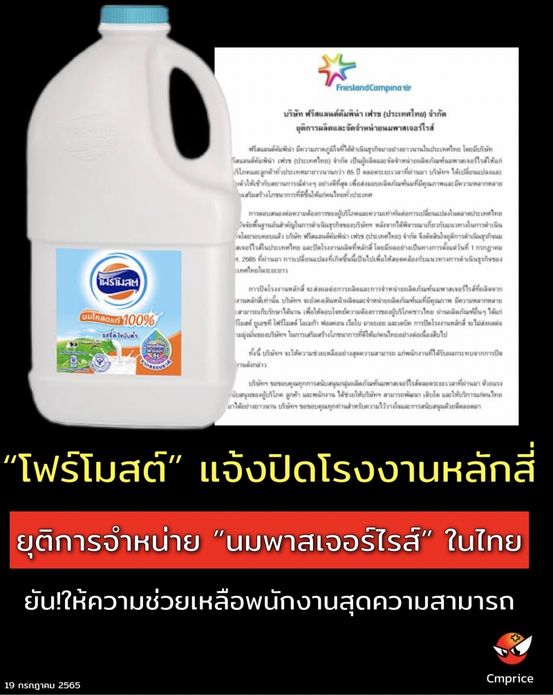 วันที่ 19 กรกฎาคม บริษัท ฟรีสแลนด์คัมพิน่า เฟรช (ประเทศไทย) จำกัด ออกแถลงการณ์ ”ยุติการผลิตและจัดจำหน่ายนมพาสเจอร์ไรส์”