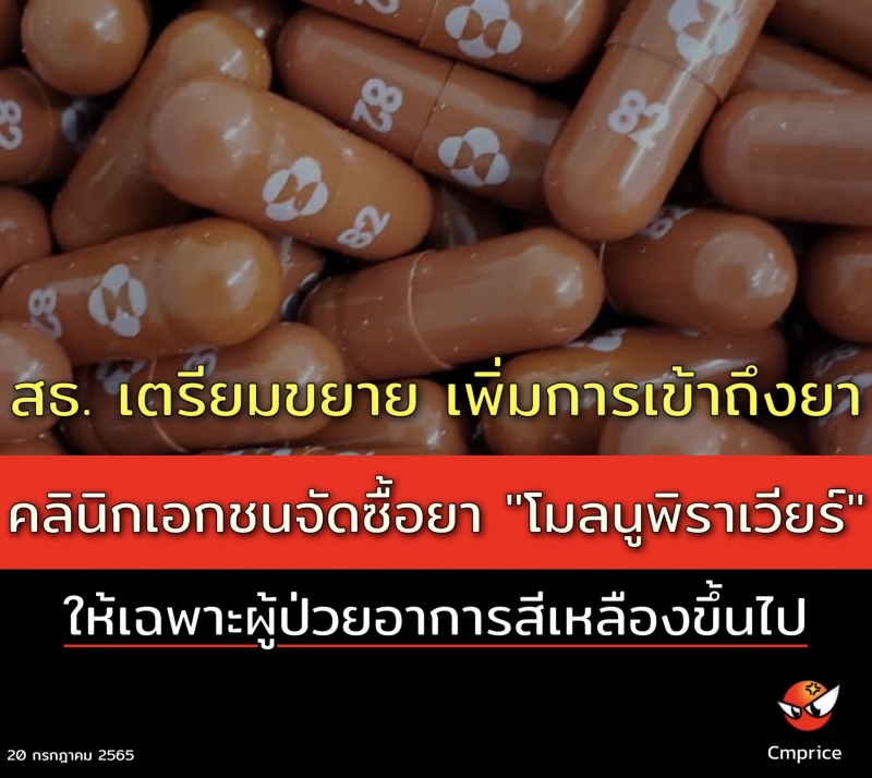 | • สธ. เตรียมขยายคลินิกเอกชนจัดซื้อยา "โมลนูพิราเวียร์" เพิ่มการเข้าถึงยา ให้เฉพาะผู้ป่วยอาการสีเหลืองขึ้นไป |