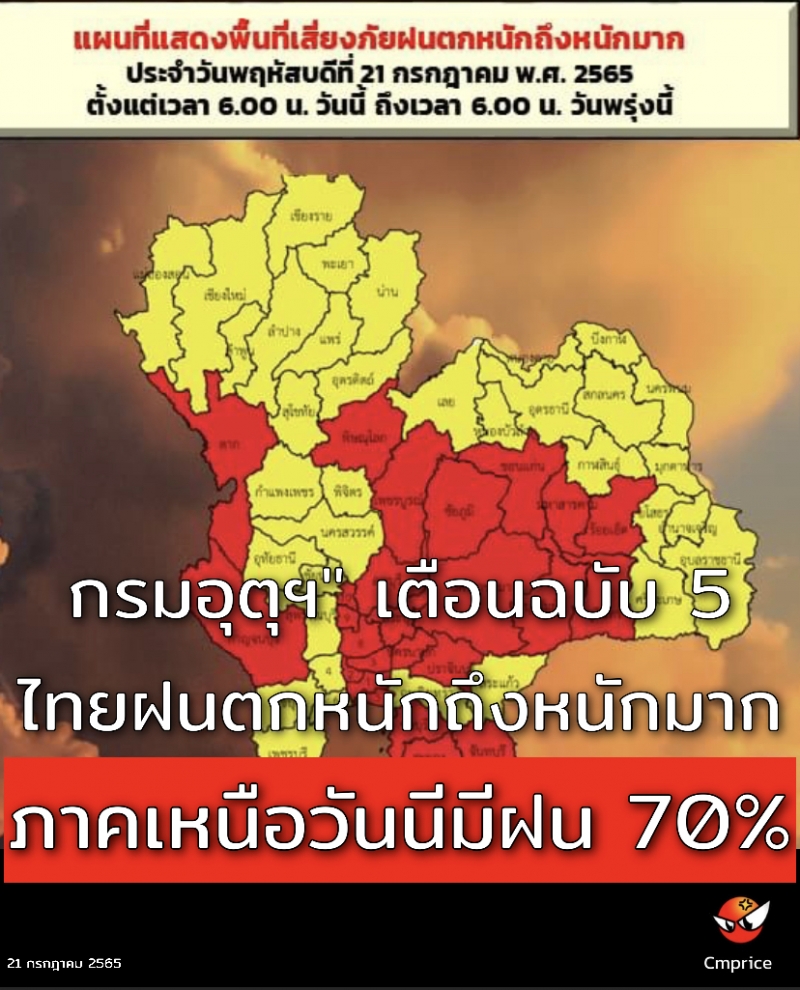 ประกาศ ณ วันที่ 21 กรกฎาคม 2565 เวลา 05.00 น. กรมอุตุนิยมวิทยา จะออกประกาศฉบับต่อไปในเวลา 17.00 น.