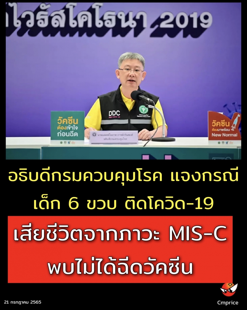 | • อธิบดีกรมควบคุมโรค แจงกรณีเด็ก 6 ขวบ ติดโควิด-19 เสียชีวิตจากภาวะ MIS-C พบไม่ได้ฉีดวัคซีน |