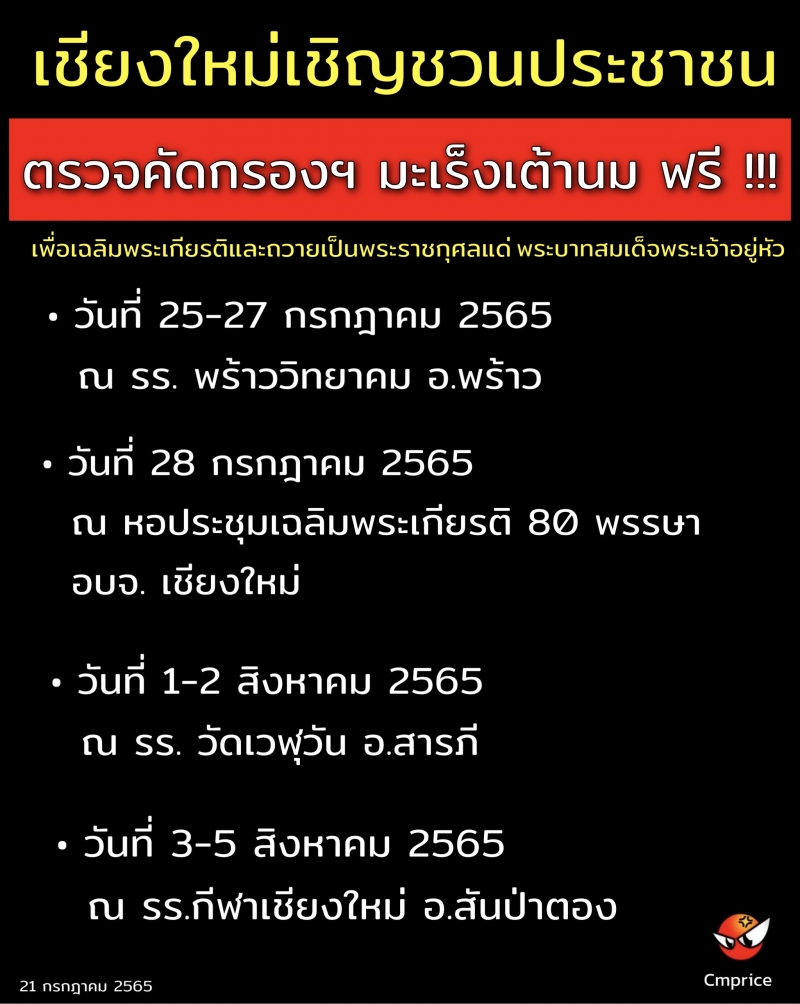 จึงขอเชิญชวนประชาชนเข้าร่วมกิจกรรมตรวจคัดกรองฯ ได้ฟรี ใน 4 พื้นที่ คือ วันที่ 25-27 กรกฎาคม 2565 ณโรงเรียนพร้าววิทยาคม อำเภอพร้าว, วันที่ 28 กรกฎาคม 2565 ณ หอประชุมเฉลิมพระเกียรติ 80 พรรษา องค์การบริหารส่วนจังหวัดเชียงใหม่, วันที่ 1-2 สิงหาคม 2565 ณ โรงเรียนวัดเวฬุวัน อำเภอสารภี และวันที่ 3-5 สิงหาคม2565 ณ โรงเรียนกีฬาเชียงใหม่ อำเภอสันป่าตอง โดยไม่มีค่าใช้จ่ายแต่อย่างใด สำหรับประชาชนที่สนใจร่วมบริจาคเงินสนับสนุนการดำเนินงานของมูลนิธิกาญจนบารมี สามารถบริจาคได้ตามกำลังศรัทธา ณ จุดให้บริการ