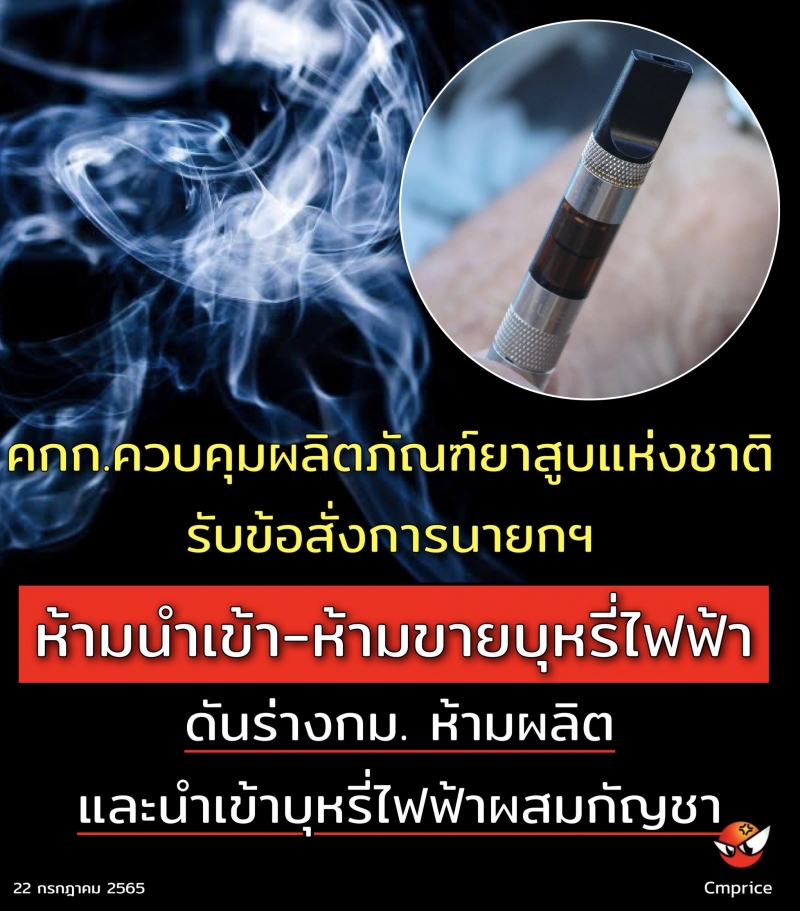 คณะกรรมการควบคุมผลิตภัณฑ์ยาสูบแห่งชาติ มีมติรับทราบข้อสั่งการนายกรัฐมนตรีในการห้ามนำเข้า -ห้ามขายบุหรี่ไฟฟ้า พร้อมทั้งผลักดันร่างกฎกระทรวงห้ามผู้ผลิต และผู้นำเข้าฯ ผลิตหรือนำเข้าเพื่อขายผลิตภัณฑ์ยาสูบประเภทบุหรี่ซิกาแรตและบุหรี่ซิการ์ ที่มีส่วนผสมของกัญชาขายในประเทศไทย ทั้งนี้ เพื่อป้องกันการเกิดนักสูบหน้าใหม่ และเป็นการคุ้มครองสุขภาพอนามัยและความปลอดภัยของประชาชน