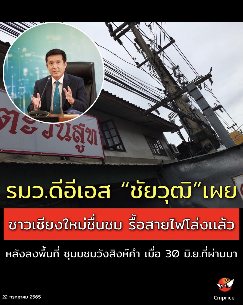 | • รมว. ดีอีเอส ชัยวุฒิ เผย ชาวเชียงใหม่ชื่นชม รื้อสายไฟโล่งเเล้ว หลังลงพื้นที่ชุมมชมวังสิงห์คำ เมื่อ 30 มิ.ย.ที่ผ่านมา |
