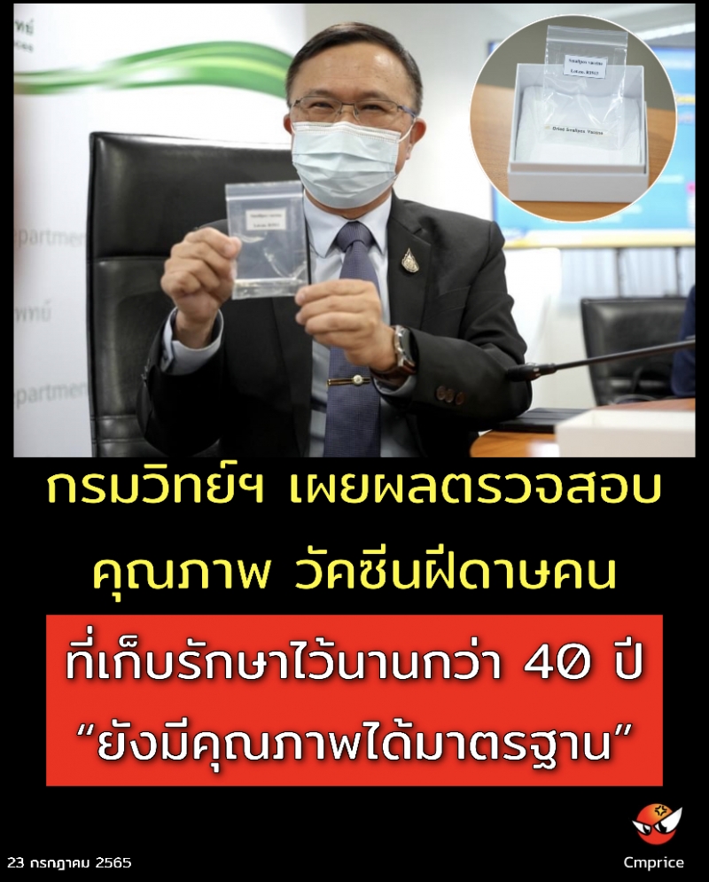 (22 กรกฎาคม 2565)ที่กรมวิทยาศาสตร์การแพทย์ จ.นนทบุรี นายแพทย์ศุภกิจ ศิริลักษณ์ อธิบดีกรมวิทยาศาสตร์การแพทย์ พร้อมด้วย ดร.สุภาพร ภูมิอมร ผู้อำนวยการสถาบันชีววัตถุ แถลงข่าว “ผลการตรวจสอบคุณภาพวัคซีนฝีดาษคน (smallpox) ที่องค์การเภสัชกรรม (อภ.) เก็บรักษาไว้นานกว่า 40 ปี” ว่า หลังจากที่องค์การอนามัยโลกได้ประกาศความสำเร็จในการกวาดล้างโรคฝีดาษไปจากโลกแล้วตั้งแต่ปี พ.ศ.2523 ทำให้การให้วัคซีนเพื่อป้องกันโรคฝีดาษในคนจึงได้หยุดไป แต่เนื่องจากพบการระบาดอีกครั้งของโรคฝีดาษวานรในต่างประเทศ ทำให้ประเทศไทยต้องเฝ้าระวังโรคนี้อย่างใกล้ชิดและเตรียมการรองรับ ซึ่งขณะนี้มีวัคซีนฝีดาษคนที่องค์การเภสัชกรรมเก็บรักษาไว้นานกว่า40 ปี และกรมวิทยาศาสตร์การแพทย์ได้นำมาตรวจสอบคุณภาพวัคซีน โดยเป็นวัคซีนเชื้อเป็นเก็บในรูปผงแห้งที่อุณหภูมิ 2-8 องศาเซลเซียส ผลิตตั้งแต่ปี พ.ศ.2522 และ 2523 จำนวน 13 รุ่นการผลิต รวม 10,000 หลอด บรรจุหลอดละ 50 โดส รวมทั้งหมด 500,000 โดส ทั้งนี้วัคซีนดังกล่าวเป็นวัคซีนรุ่นแรกที่ผลิตจากน้ำเหลืองของสัตว์ รูปแบบการนำมาใช้โดยการหยดลงผิวหนังและใช้เข็มสะกิดผิวให้ถลอกเพื่อให้วัคซีนซึมผ่าน