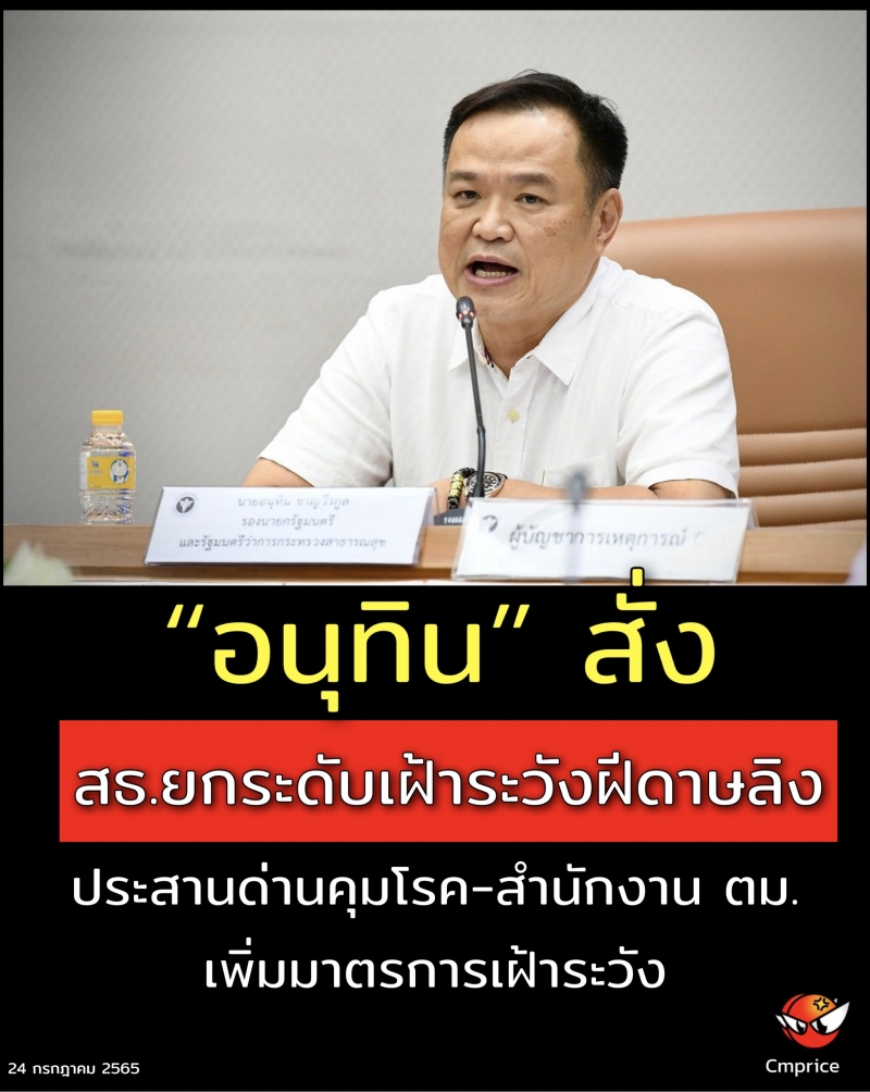 กับภาพรวม นายอนุทิน ได้สั่งการยกระดับการเฝ้าระวังโรคฝีดาษลิงจากศูนย์ปฏิบัติการภาวะฉุกเฉิน (EOC) ของกรมควบคุมโรค เป็นศูนย์ EOC ที่มีปลัดกระทรวงสาธารณสุขเป็นประธาน เพื่อทำให้การสั่งการ การเฝ้าระวัง มีความครอบคลุมระดับประเทศ และย้ำว่า ความสามารถในการแพร่เชื้อของโรคฝีดาษลิง ยังไม่ได้อยู่ระดับเดียวกันกับโควิดนอกจากนั้นมาตรการป้องกันโควิดที่ใช้อยู่ในช่วงนี้ คือ สวมหน้ากาก ล้างมือ เว้นระยะห่าง จะสามารถลดความเสี่ยงการติดเชื้อฝีดาษลิงได้อย่างมีประสิทธิภาพ ทั้งยังเป็นการป้องันโควิด-19 ไปพร้อมกันด้วย