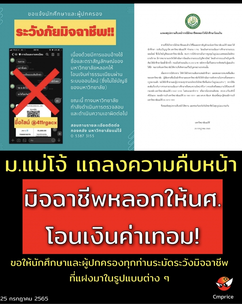 ม.แม่โจ้ สรุปความคืบหน้ากรณีมิจฉาชีพหลอกให้นศ.โอนเงินค่าเทอม!! 20,000 บาท อ้างว่าระบบเกิดปัญหา
