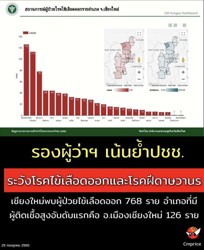 รองผู้ว่าราชการจังหวัดเชียงใหม่เน้นย้ำให้ประชาชนระมัดระวังโรคไข้เลือดออกและโรคฝีดาษวานร (Monkeypox) หลังองค์การอนามัยโลก (WHO) ได้ประกาศให้เป็นภาวะฉุกเฉินด้านสาธารณสุขระหว่างประเทศ (PHEIC)