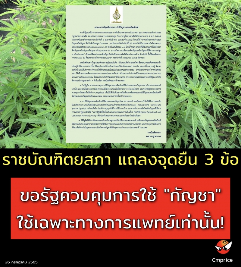 | • ราชบัณฑิตยสภา แถลงจุดยืน 3 ข้อ ขอรัฐควบคุมการใช้ "กัญชา" ใช้เฉพาะทางการแพทย์เท่านั้น |