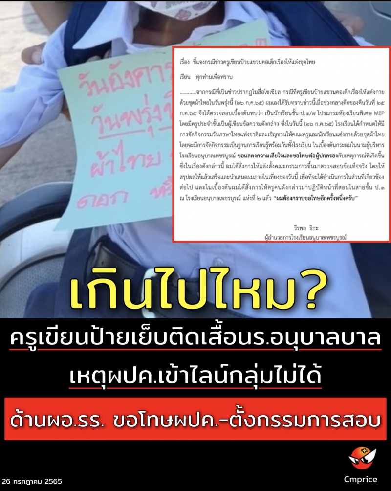 | • เกินไปไหม? ครูเขียนป้ายเย็บติดเสื้อนร.อนุบาล เหตุผปค.เข้าไลน์กลุ่มไม่ได้ ด้านผอ.รร. ขอโทษผปค.-ตั้งกรรมการสอบ |