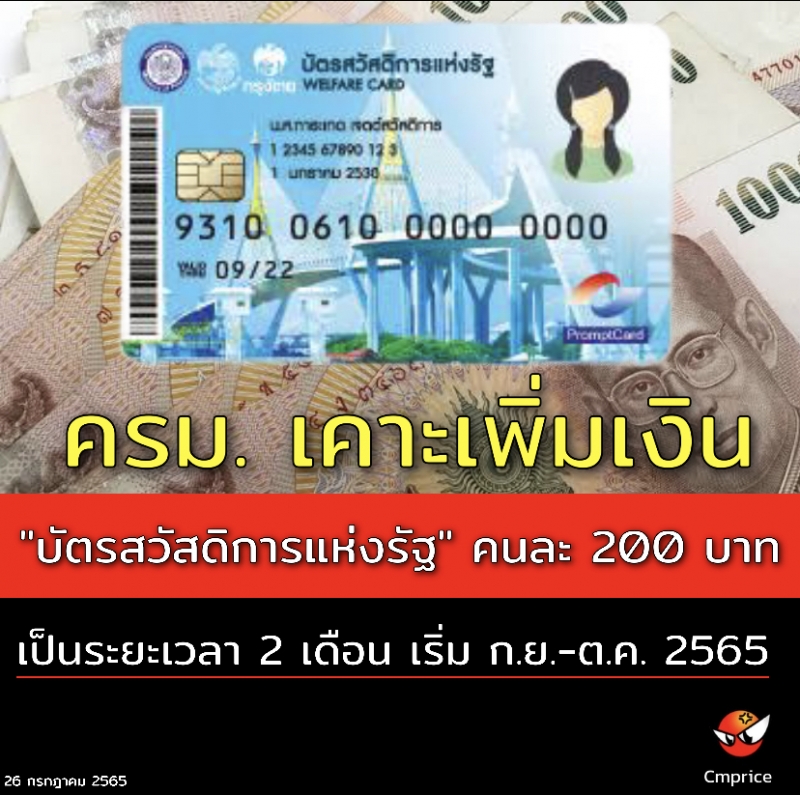 | • ครม. เคาะเพิ่มเงิน "บัตรสวัสดิการแห่งรัฐ" คนละ 200 บาท เป็นระยะเวลา 2 เดือน เริ่ม ก.ย. - ต.ค. 2565 |