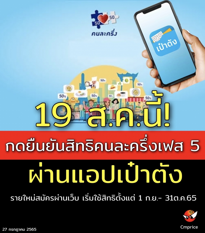 | • 19 ส.ค.นี้! คนใช้สิทธิคนละครึ่ง เฟส 4 กดยืนยันสิทธิเข้าร่วมเฟส 5 ผ่านแอปเป๋าตัง |