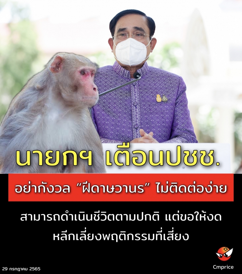 วันนี้ (29 กรกฎาคม 2565) นายธนกร วังบุญคงชนะ โฆษกประจำสำนักนายกรัฐมนตรี เปิดเผยว่า พลเอก ประยุทธ์ จันทร์โอชา นายกรัฐมนตรีและรัฐมนตรีว่าการกระทรวงกลาโหม รับทราบรายงานจากทางสาธารณสุขยืนยันไทยพบผู้ป่วยฝีดาษวานรรายที่ 2 ในพื้นที่กรุงเทพมหานคร ได้สั่งการให้กระทรวงสาธารณสุขจัดทีมเจ้าหน้าที่ติดตามและคัดกรองผู้มีความเสี่ยง เพื่อความปลอดภัยในพื้นที่ พร้อมเตือนประชาชนอย่าตื่นตระหนกเกินไปประชาชนทั่วไป สามารถดำเนินชีวิตตามปกติ แต่ขอให้งดหรือหลีกเลี่ยงพฤติกรรมที่เสี่ยง ทั้งนี้ โรคโควิด-19 และโรคฝีดาษวานร สามารถป้องกันการติดเชื้อ ด้วยการดูแลตนเองด้วยมาตรการสุขอนามัย
