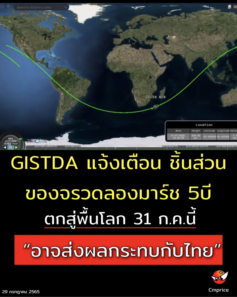 GISTDA โดยศูนย์วิจัยเทคโนโลยีอวกาศ หรือ Space Technology Research Center แจ้งเตือนชิ้นส่วนของจรวดลองมาร์ช 5บี (Longmarch-5B) จะตกสู่พื้นโลกในวันอาทิตย์ที่ 31 กรกฎาคม 2565 และอาจส่งผลกระทบกับประเทศไทย เนื่องจากวัตถุอวกาศนี้ผ่านประเทศไทยทุกวัน (โคจรตามเส้นสีเขียวดังภาพ) โดยวัตถุอวกาศดังกล่าวมีน้ำหนักประมาณ 21 ตัน (ระหว่างที่วัตถุอวกาศกำลังตกสู่โลกนั้น จะมีน้ำหนักน้อยกว่านี้ เนื่องจากจะมีบางส่วนถูกเผาไหม้ในชั้นบรรยากาศ)