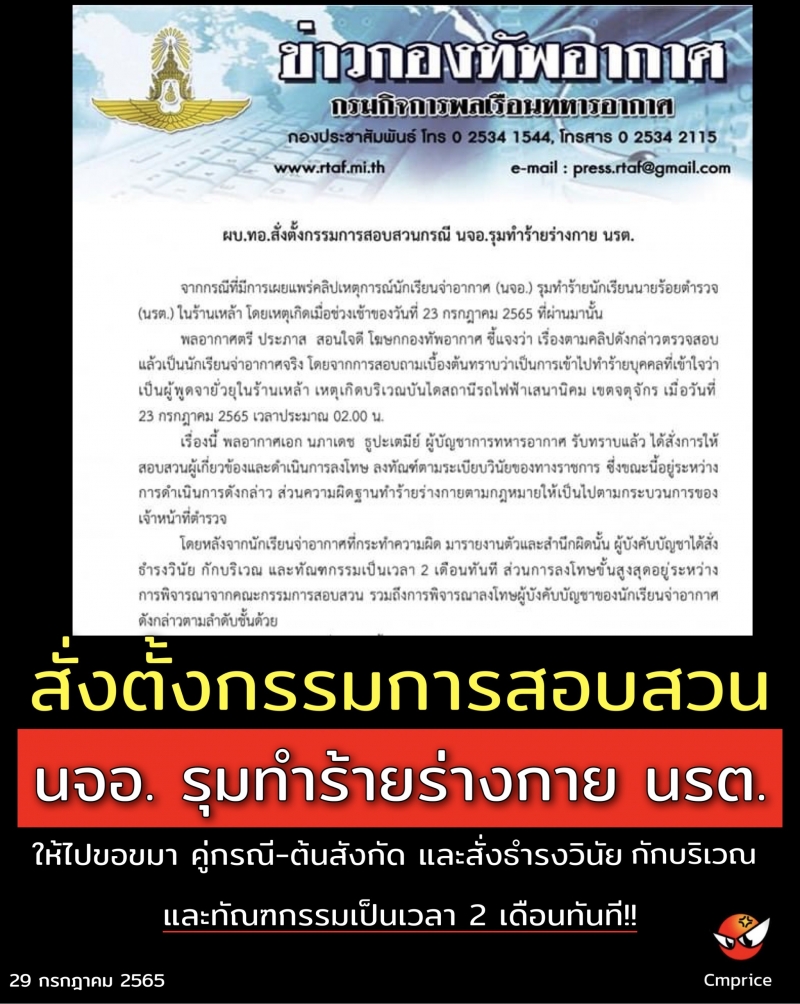 จากกรณีที่มีการเผยแพร่คลิปเหตุการณ์นักเรียนจ่าอากาศ (นจอ.) รุมทำร้ายนักเรียนนายร้อยตำรวจ (นรต.) ในร้านเหล้า โดยเหตุเกิดเมื่อช่วงเช้าของวันที่ 23 กรกฎาคม 2565 ที่ผ่านมานั้น