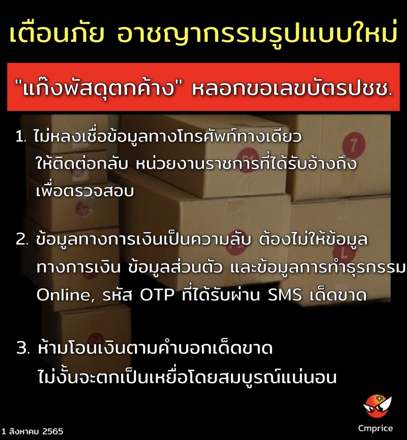 | • ตร เตือนภัย อาชญากรรมรูปแบบใหม่ "แก๊งพัสดุตกค้าง" หลอกขอเลขบัตรประชาชน |