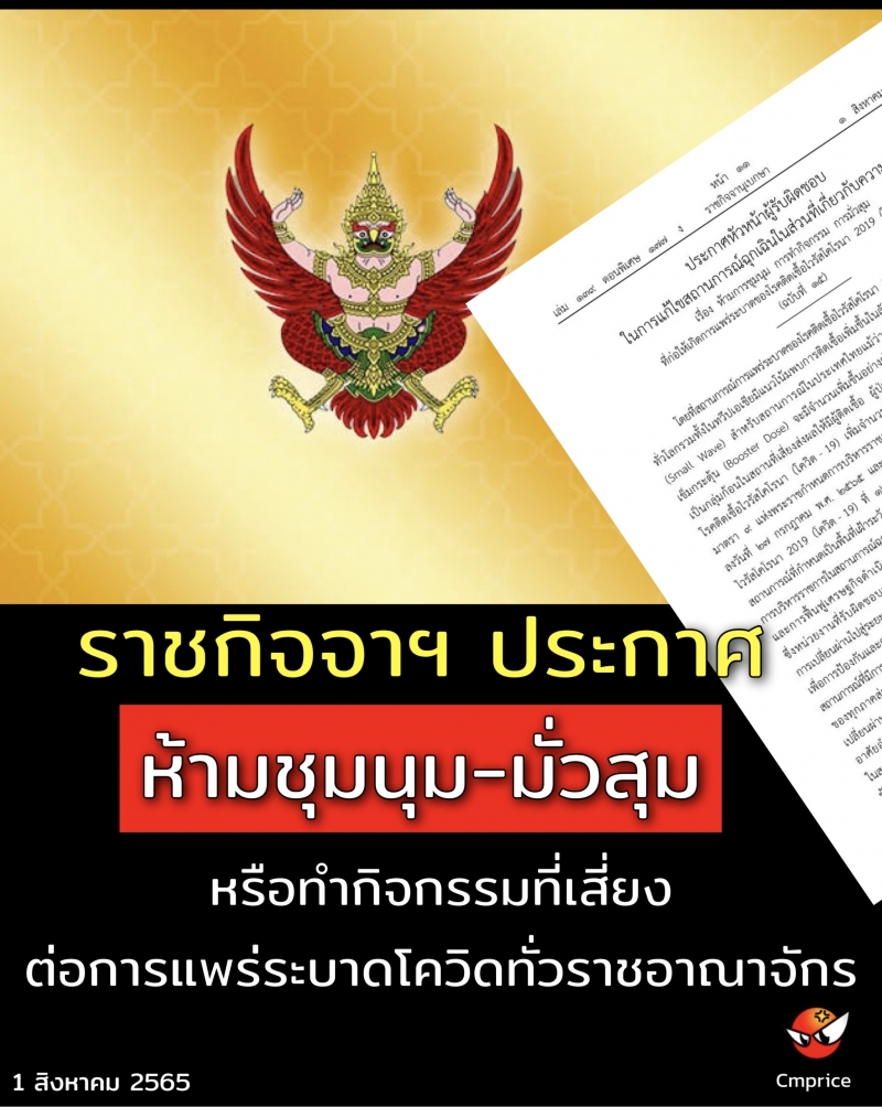 1 สิงหาคม 2565 ราชกิจจานุเบกษา เผยแพร่ ประกาศหัวหน้าผู้รับผิดชอบในการแก้ไขสถานการณ์ฉุกเฉินในส่วนที่เกี่ยวกับความมั่นคง เรื่อง ห้ามการชุมนุม การทำกิจกรรม การมั่วสุม ที่ก่อให้เกิดการแพร่ระบาดของโรคติดโรคโควิด-19 จึงให้ปฏิบัติ ดังนี้