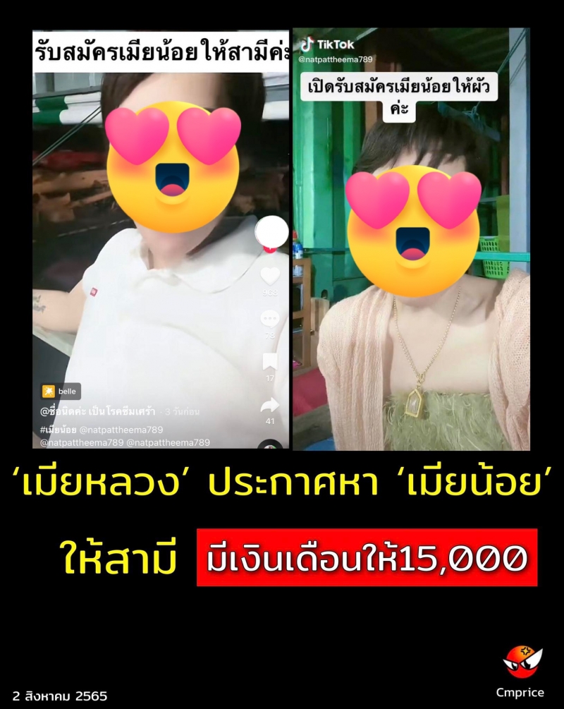 สนั่นโซเชี่ยล กรณีมีผู้ใช้Tiktok ชื่อ natpattheema789 โพสต์คลิปประกาศเปิดรับสมัครเมียน้อย 3 อัตรา ให้สามี ซึ่งคลิปดังกล่าว มีผู้เข้าชมและแชร์ออกไปเป็นจำนวนมาก โดยเจ้าของคลิประบุว่า มีเงินเดือนให้เดือนละ 15,000 บาทให้อยู่กินอย่างสุขสบาย โดยมีข้อตกลงสำหรับใครที่จะมาเป็นภรรยาน้อยของครอบครัวนี้ จะต้องมีอายุ 30-35 ปี มีการศึกษาอย่างน้อยม.ปลายถึงปริญญาตรี หน้าตาดีพร้อมรับประกันว่าจะไม่มีการตบตีทำร้ายร่างกายแน่นอนและต้องช่วยกันทำงาน เธออยากได้คนมาช่วยทำงานเสมียนในออฟฟิศ 2 คน และเป็นแม่บ้าน 1 คน ช่วยดูแลตน สามี และลูกสาว ตำแหน่งแม่บ้านจะได้เงินเดือนมากกว่า ประมาณ 20,000 บาท