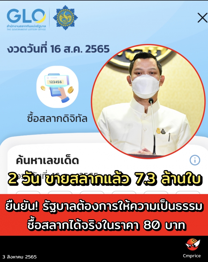 วันนี้ (3 สิงหาคม 2565) นายธนกร วังบุญคงชนะ โฆษกประจำสำนักนายกรัฐมนตรี เผยสลากดิจิทัล งวดวันที่ 16 สิงหาคม 2565 จำนวน 9,092,500 ใบ ที่จำหน่ายผ่านแอป “เป๋าตัง” ณ เวลา 23.00 น. วันที่ 2 สิงหาคม 2565 จำหน่ายสลากแล้ว 7,313,672 ใบ จำนวนผู้ซื้อสลาก 1,066,413 ราย คงเหลือสลากในระบบ 1,778,828 ใบ