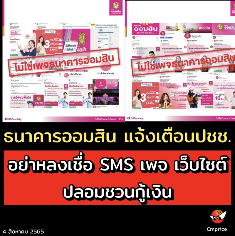 | • ธนาคารออมสิน ขอแจ้งเตือนประชาชนอย่าหลงเชื่อ SMS เพจ เว็บไซต์ ปลอมชวนกู้เงิน |