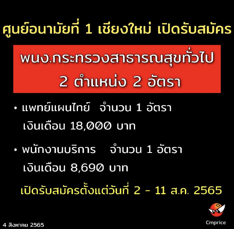เปิดรับสมัครตั้งแต่วันที่ 2 - 11 สิงหาคม 2565 สามารถดาวน์โหลดใบสมัคร และเข้าดูรายละเอียดเพิ่มเติมได้ที่เว็บไซต์ศูนย์อนามัยที่ 1 เชียงใหม่ https://hpc1.anamai.moph.go.th/th/jobs