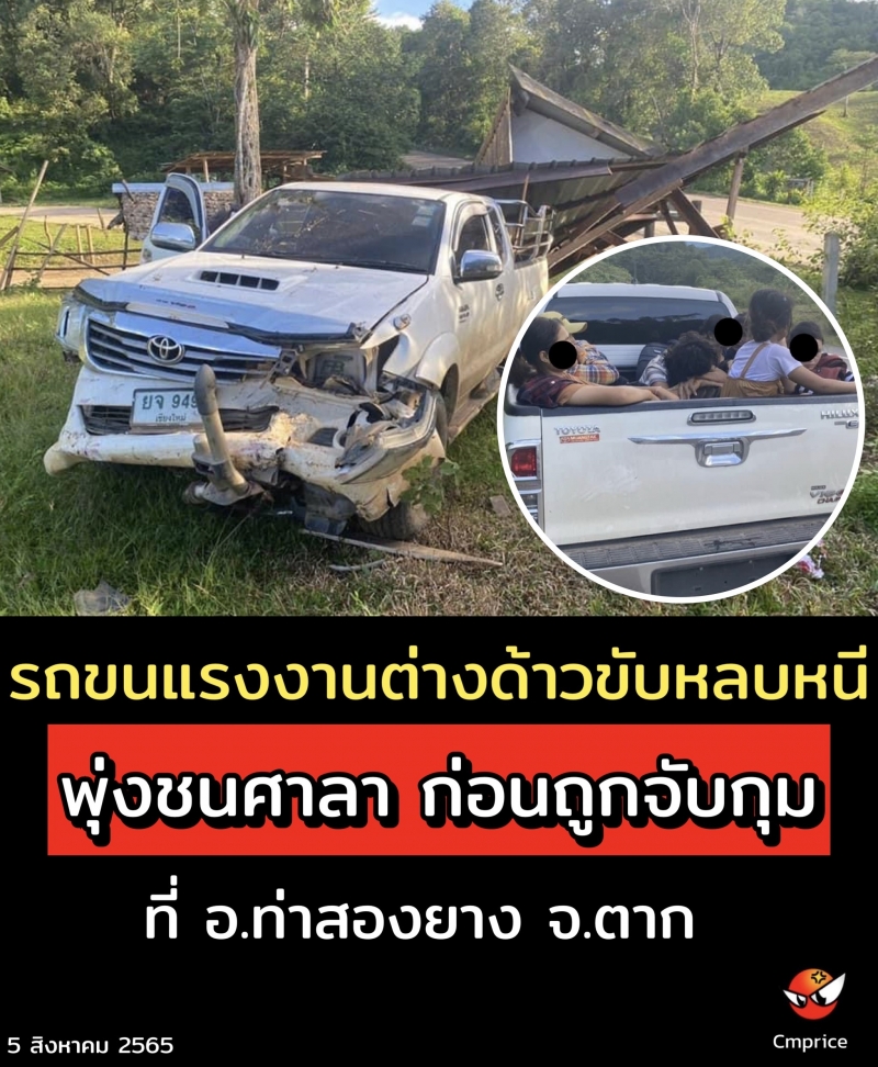 กองร้อยทหารพรานที่ 3508 หน่วยเฉพาะกิจกรมทหารพรานที่ 35 ร่วมกับ เจ้าหน้าที่ตำรวจสถานีตำรวจภูธรแม่เมย ภายหลังได้รับแจ้งจากแหล่งข่าวว่าจะมีกระบวนการลักลอบขนแรงงานต่างด้าวเข้าเมืองโดยผิดกฏหมายในพื้นที่รับผิดชอบ จึงได้จัดกำลังพลจำนวน 1 ชุดปฏิบัติการ ร่วมกับ สถานีตำรวจภูธรแม่เมย ออกทำการ ซุ่ม/เฝ้าตรวจ บริเวณเส้นทาง บ้านแม่ตื่น - บ้านแม่ลอ โดยได้ตรวจพบรถยนต์กระบะ ยี่ห้อ โตโยต้า วีโก้ สีขาว ติดโครงเหล็ก หมายเลขทะเบียน ยจ 9498 เชียงใหม่ ขับผ่านมาด้วยความเร็ว จึงให้สัณญานหยุดเพื่อขอตรวจค้น แต่รถคันดังกล่าวได้เร่งเครื่องยนต์ขับหลบหนีมุ่งหน้าไปยัง เส้นทางหลวงหมายเลข 105 ( แม่สอด - แม่สะเรียง ) และขับต่อมุ่งหน้าไปยังอำเภอแม่สะเรียง จังหวัดแม่ฮ่องสอน เจ้าหน้าที่ชุดจับกุมจึงได้ทำการติดตาม กระทั่งถึงบริเวณทางแยกเข้าหมู่บ้านบ้านแม่เหว่ยโพคี หมู่ที่ 4 ตำบลแม่วะหลวง อำเภอท่าสองยาง จังหวัดตาก พบรถยนต์คันดังกล่าว เสียหลักตกข้างทาง และพุ่งชนศาลาพักของแขวงทางหลวงจนพังเสียหาย ตรวจสอบภายในรถพบ นายศรัณย์ ศิลปินธำรง อายุ 27 ปีบ้านเลขที่ 23/2 หมู่ที่ 10 ตำบลสบโขง อำเภออมก๋อย จังหวัดเชียงใหม่ (เป็นผู้ขับขี่ ) พร้อมด้วยแรงงานต่างด้าว(หญิง) จำนวน 10 คน บรรทุกมาในตัวเก๋ง และท้ายกระบะ และพบมีผู้บาดเจ็บ (ศรีษะแตก) จำนวน 1 คน จึงได้นำตัวส่ง รักษาพยาบาล ณ โรงพยาบาลส่งเสริมสุขภาพตำบลบ้านท่าสองยาง ตำบลท่าสองยาง