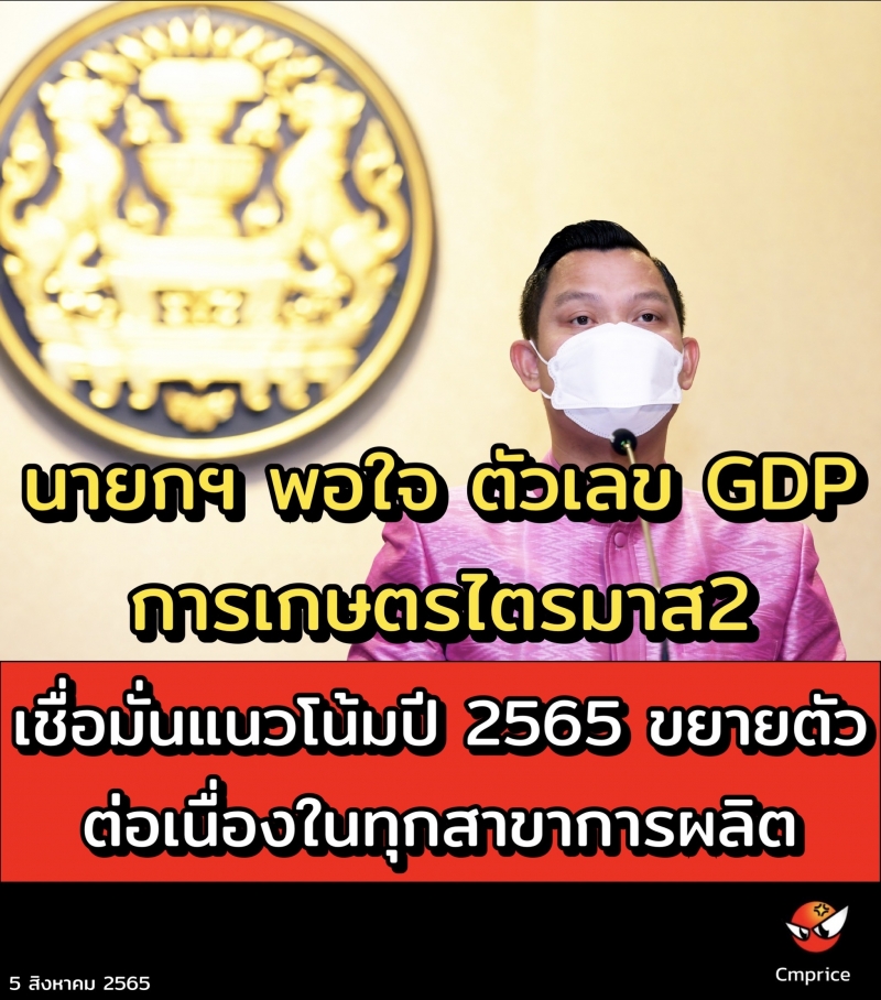 วันนี้ (5 ส.ค.65) นายธนกร วังบุญคงชนะ โฆษกประจำสำนักนายกรัฐมนตรี เปิดเผยว่า พลเอก ประยุทธ์ จันทร์โอชานายกรัฐมนตรีและรัฐมนตรีว่าการกระทรวงกลาโหม รับทราบผลการดำเนินงาน และ พอใจตัวเลข GDPการเกษตรไตรมาส 2 ซึ่งขยายตัวร้อยละ 5.7 เชื่อมั่นว่าแนวโน้มเศรษฐกิจการเกษตรในปี 2565 จะขยายตัวต่อเนื่องในทุกสาขาการผลิต ขอบคุณทุกหน่วยงานที่เกี่ยวข้องร่วมพัฒนาศักยภาพการผลิตสินค้าเกษตรอย่างมีประสิทธิภาพ พร้อมเดินหน้านโยบายส่งเสริมอุตสาหกรรมสร้างสรรค์ มุ่งเน้นการเพิ่มมูลค่าผลิตภัณฑ์ด้วยความคิดสร้างสรรค์ เพื่อสร้างศักยภาพให้กับอุตสาหกรรมไทยสู่ระดับนานาชาติ