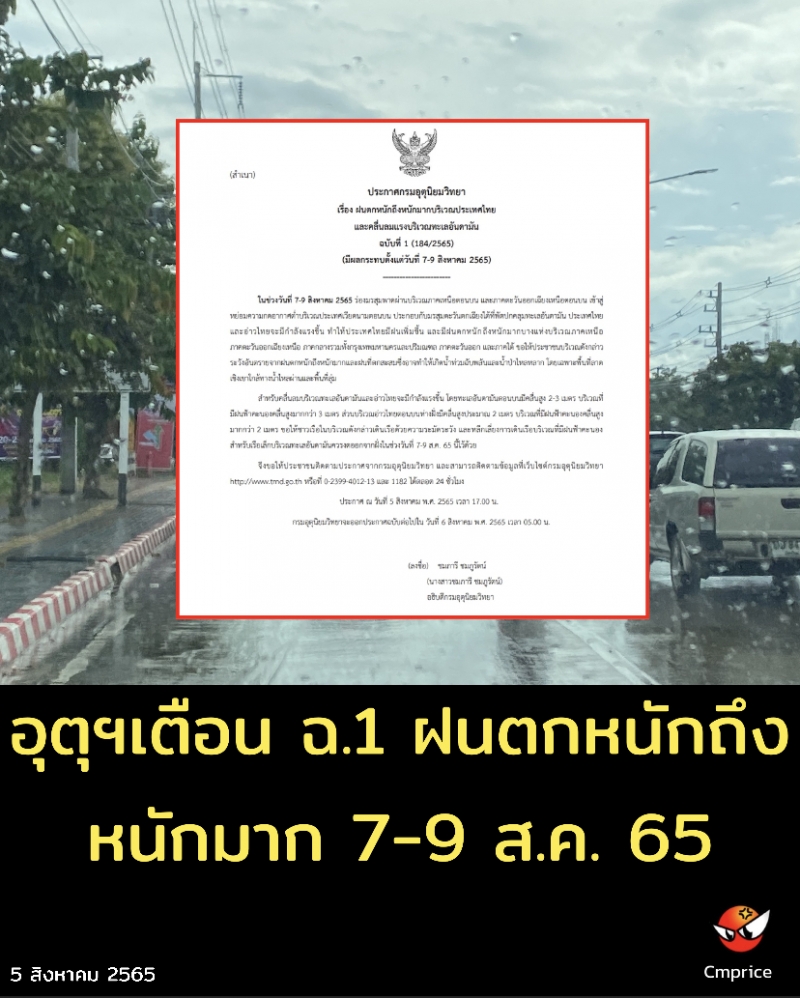 กรมอุตุนิยมวิทยา ออกประกาศ ฉบับที่ 1 เรื่อง "ฝนตกหนักถึงหนักมากบริเวณประเทศไทยและคลื่นลมแรงบริเวณทะเลอันดามัน (มีผลกระทบตั้งแต่วันที่ 7-9 สิงหาคม 2565) ระบุว่า ในช่วงวันที่ 7-9 สิงหาคม 2565 ร่องมรสุมพาดผ่านบริเวณภาคเหนือตอนบน และภาคตะวันออกเฉียงเหนือตอนบน เข้าสู่หย่อมความกดอากาศต่ำบริเวณประเทศเวียดนามตอนบน ประกอบกับมรสุมตะวันตกเฉียงใต้ที่พัดปกคลุมทะเลอันดามัน ประเทศไทย และอ่าวไทยจะมีกำลังแรงขึ้น ทำให้ประเทศไทยมีฝนเพิ่มขึ้น และมีฝนตกหนักถึงหนักมากบางแห่งบริเวณภาคเหนือ ภาคตะวันออกเฉียงเหนือ ภาคกลางรวมทั้งกรุงเทพมหานครและปริมณฑล ภาคตะวันออก และภาคใต้